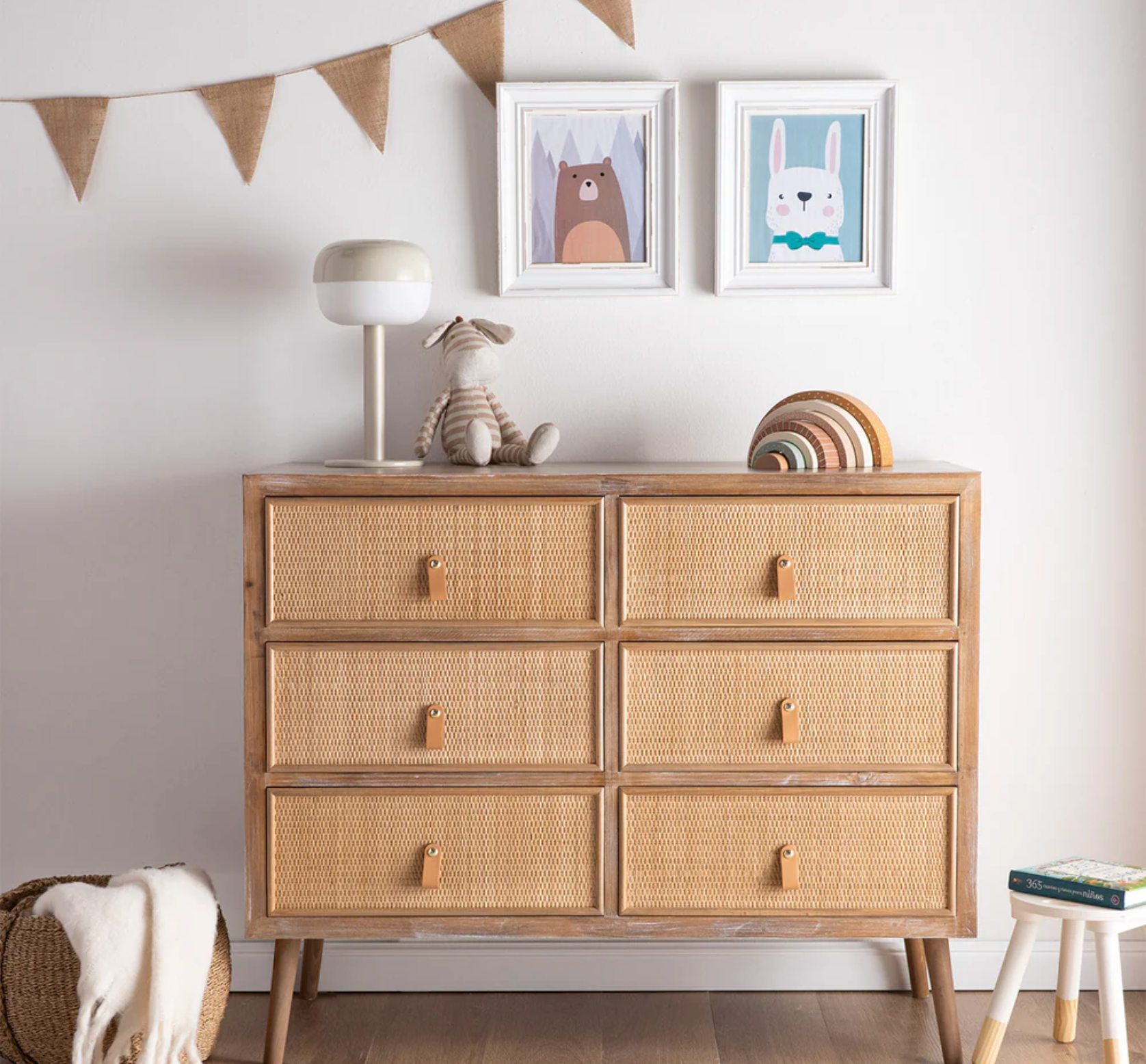 Delimitar el área de juego con una alfombra o una estantería permite mantener el resto del espacio ordenado. Las cajas etiquetadas o cestas de fibras naturales son ideales para guardar juguetes por categorías.