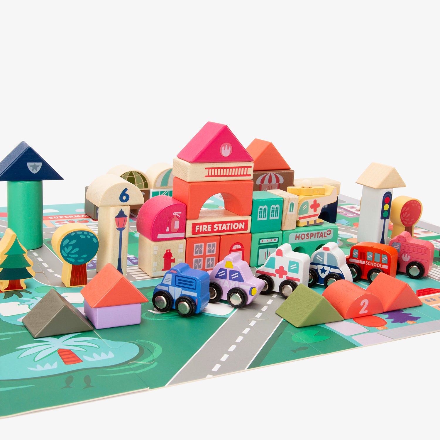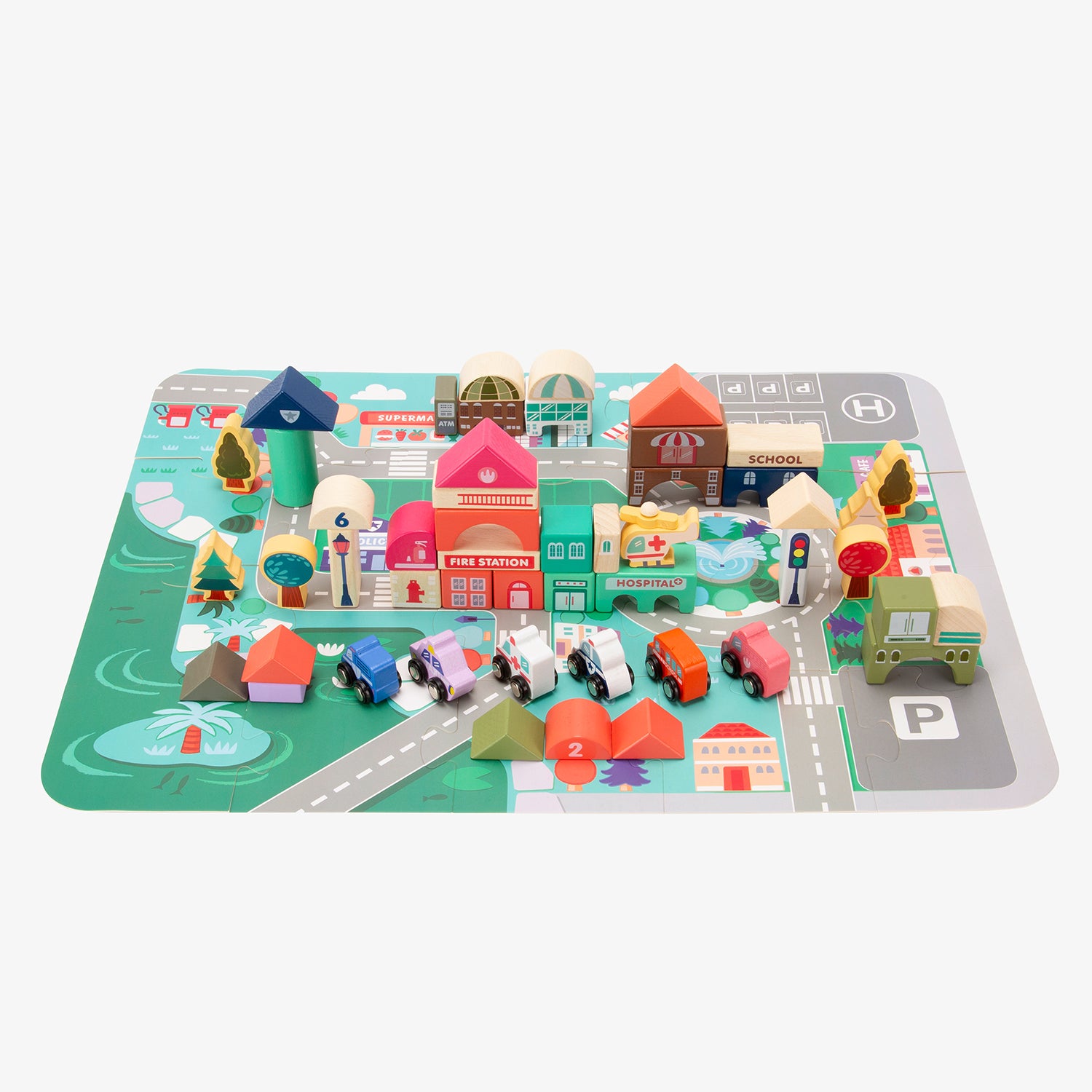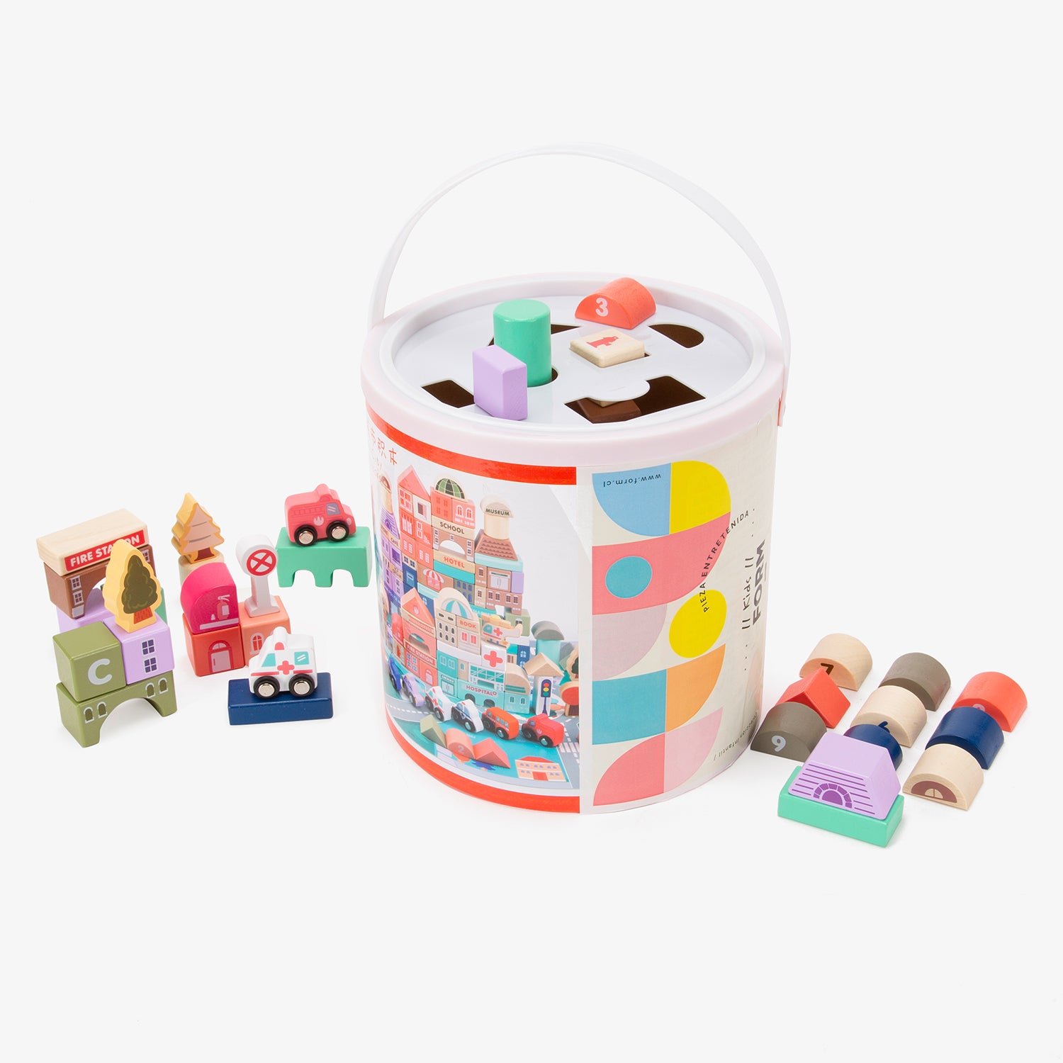 La ciudad de bloques de madera Santiago es ideal para que los niños desarrollen su creatividad e imaginación. Los juguetes de madera son biodegradables, no pasan de moda y estimulan el deseo de conocimiento en los más pequeños.
