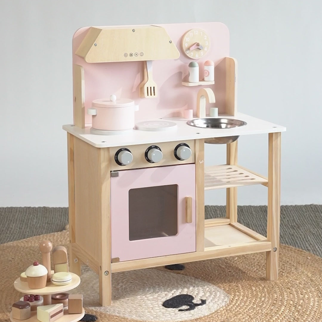 La cocina Maia cuenta está full equipada para que los niños se diviertan jugando en su propia cocina. Cuenta con un horno con puerta, un estante de almacenamiento, un lavaplatos con grifería, una encimera con dos fuegos y un reloj. Todas sus puertas se abren, las perillas y llave del lavamanos se giran.