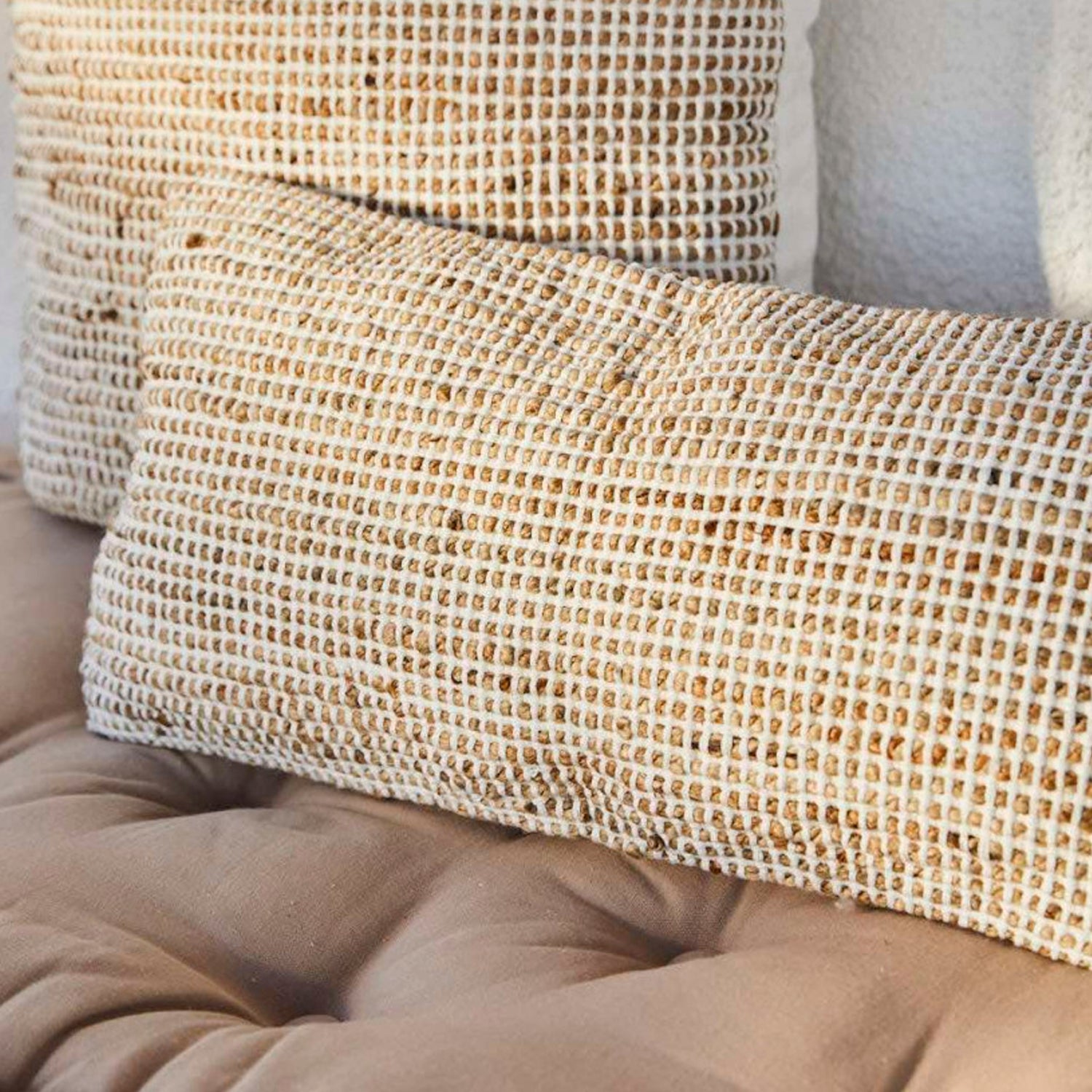 La funda de cojín West está confeccionada de yute y un cuadrillé tejido con hilo de algodón blanco. Su diseño único es perfecto para combinar con cualquier tipo de ambiente, añadiéndole toques rústicos y naturales.