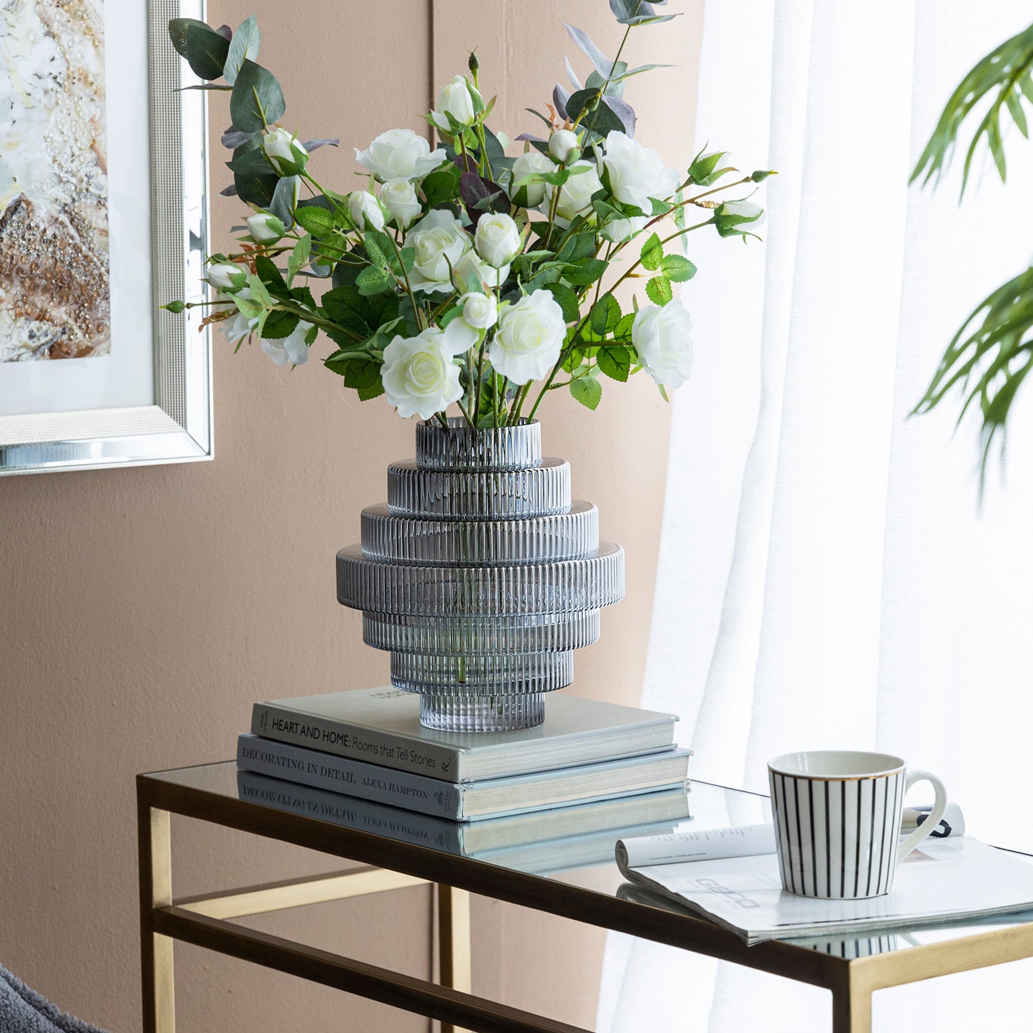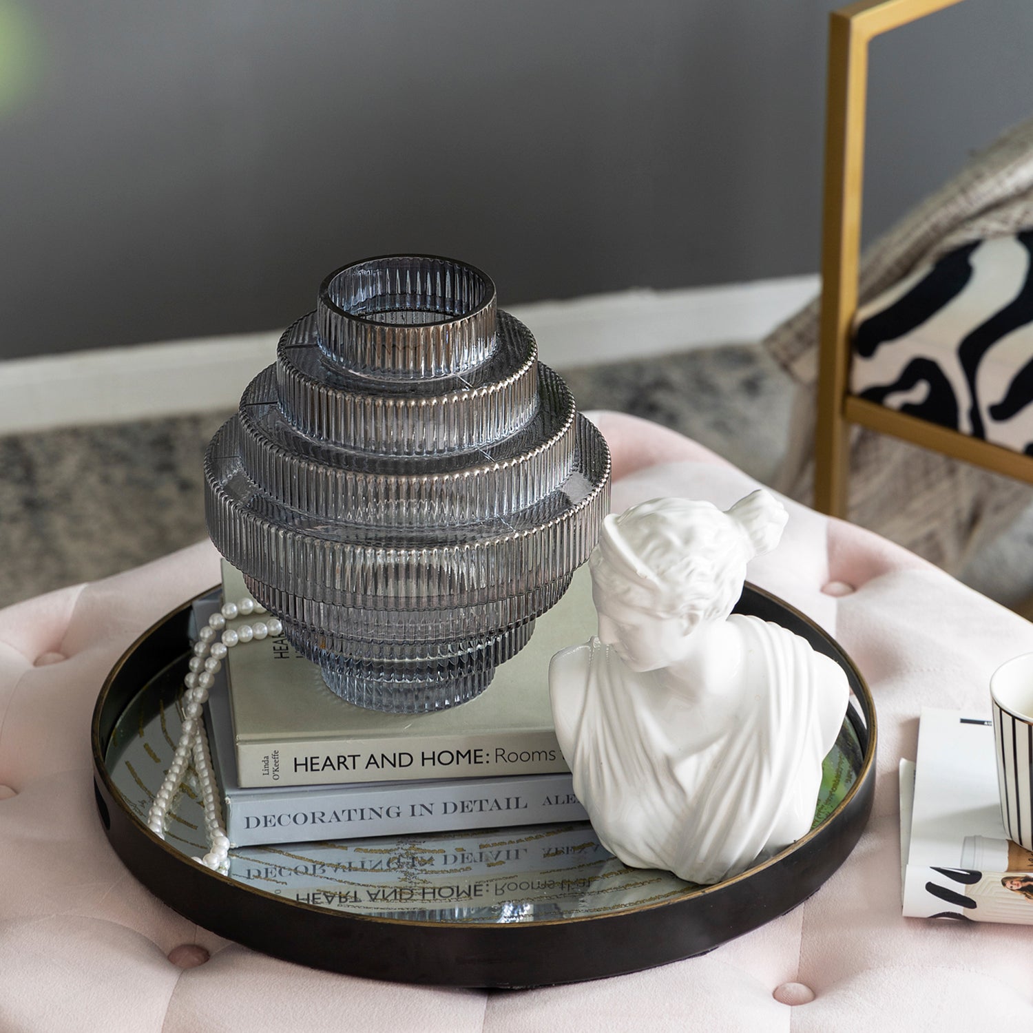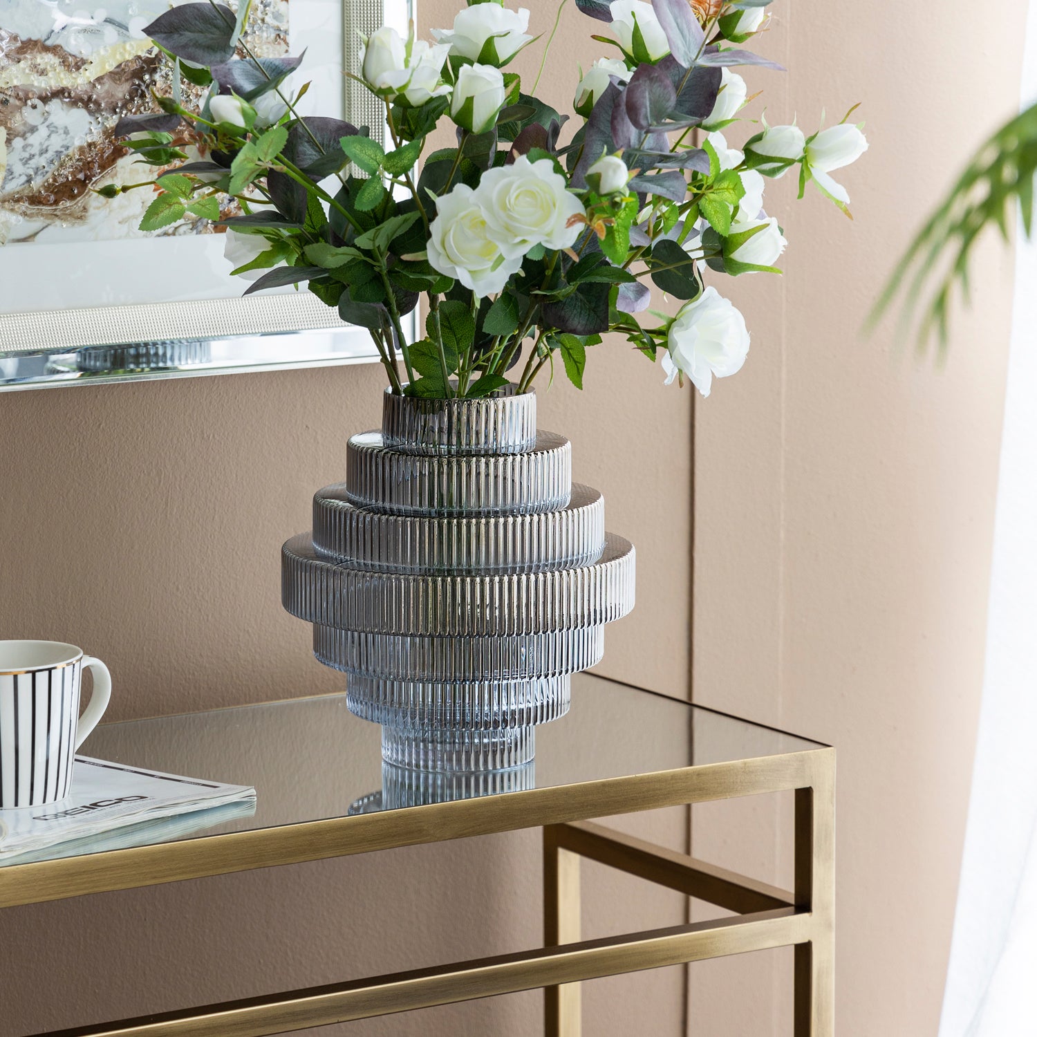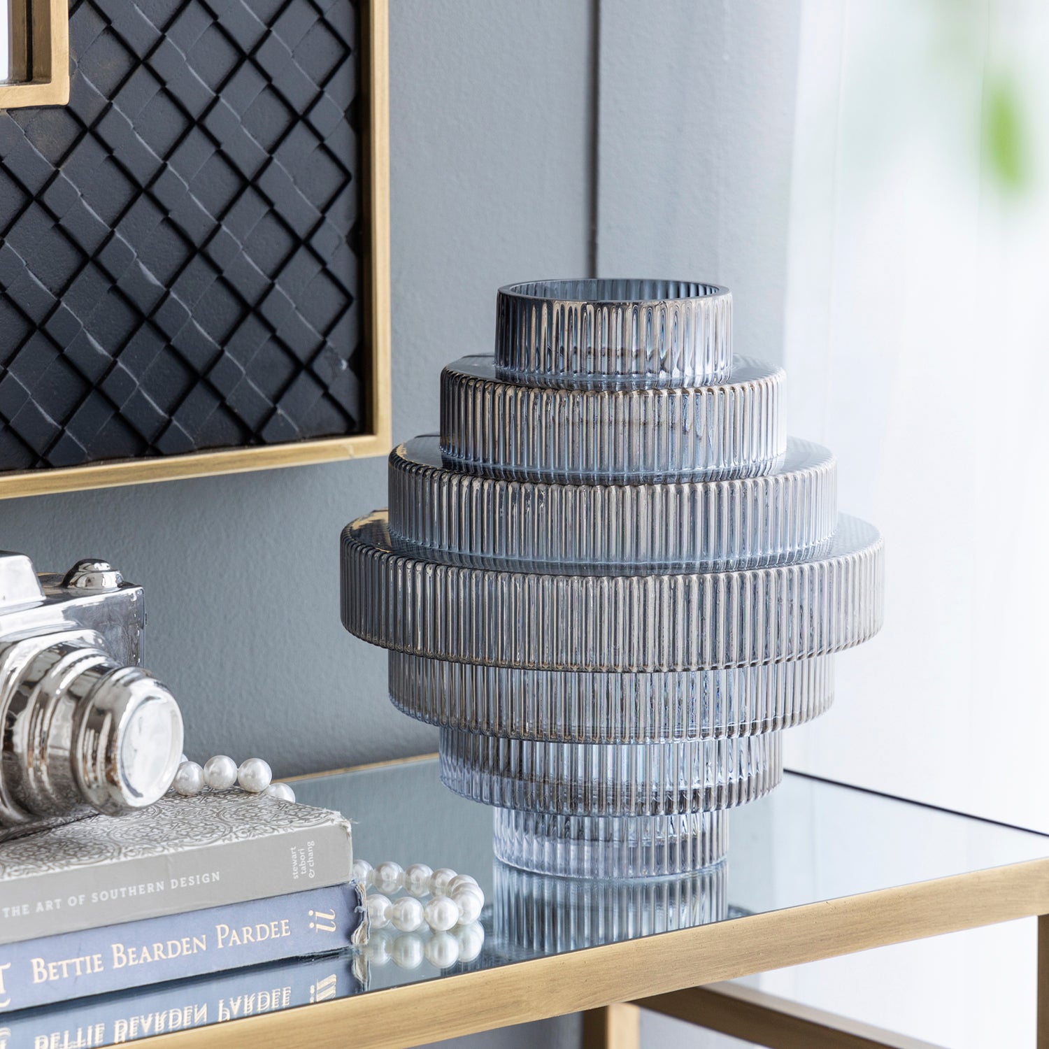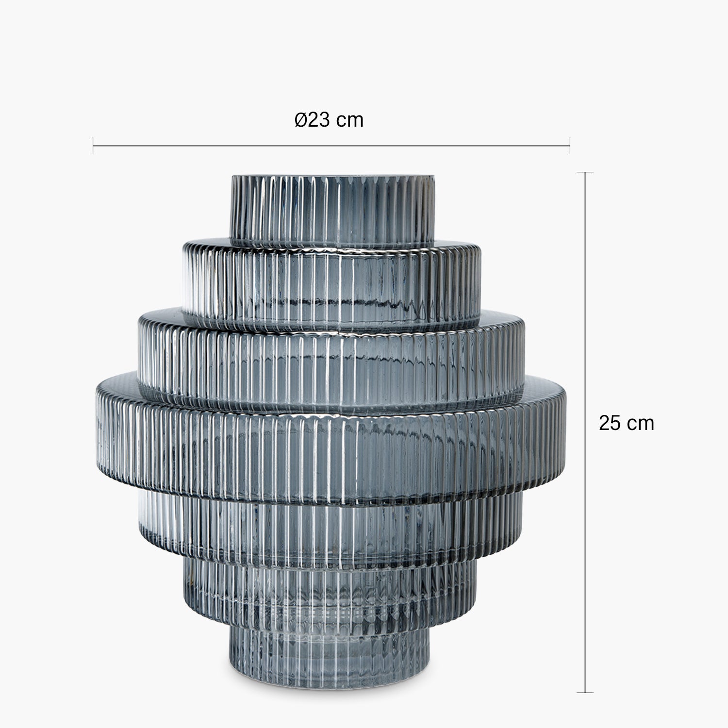 El Jarrón Kivu es una pieza sofisticada que fusiona diseño y elegancia. Elaborado en vidrio, su estructura en niveles y delicadas líneas texturizadas crean un efecto visual único que juega con la luz y realza la belleza de cualquier espacio. Su silueta escultural lo convierte en un elemento decorativo ideal para añadir un toque moderno y refinado a tu hogar.
