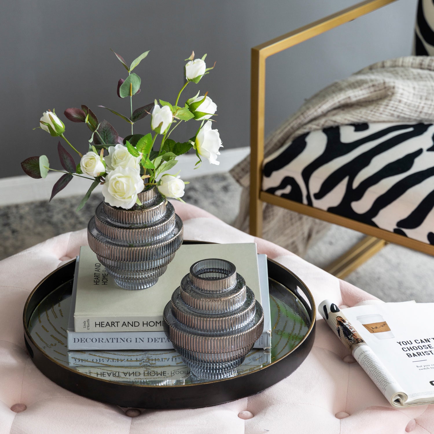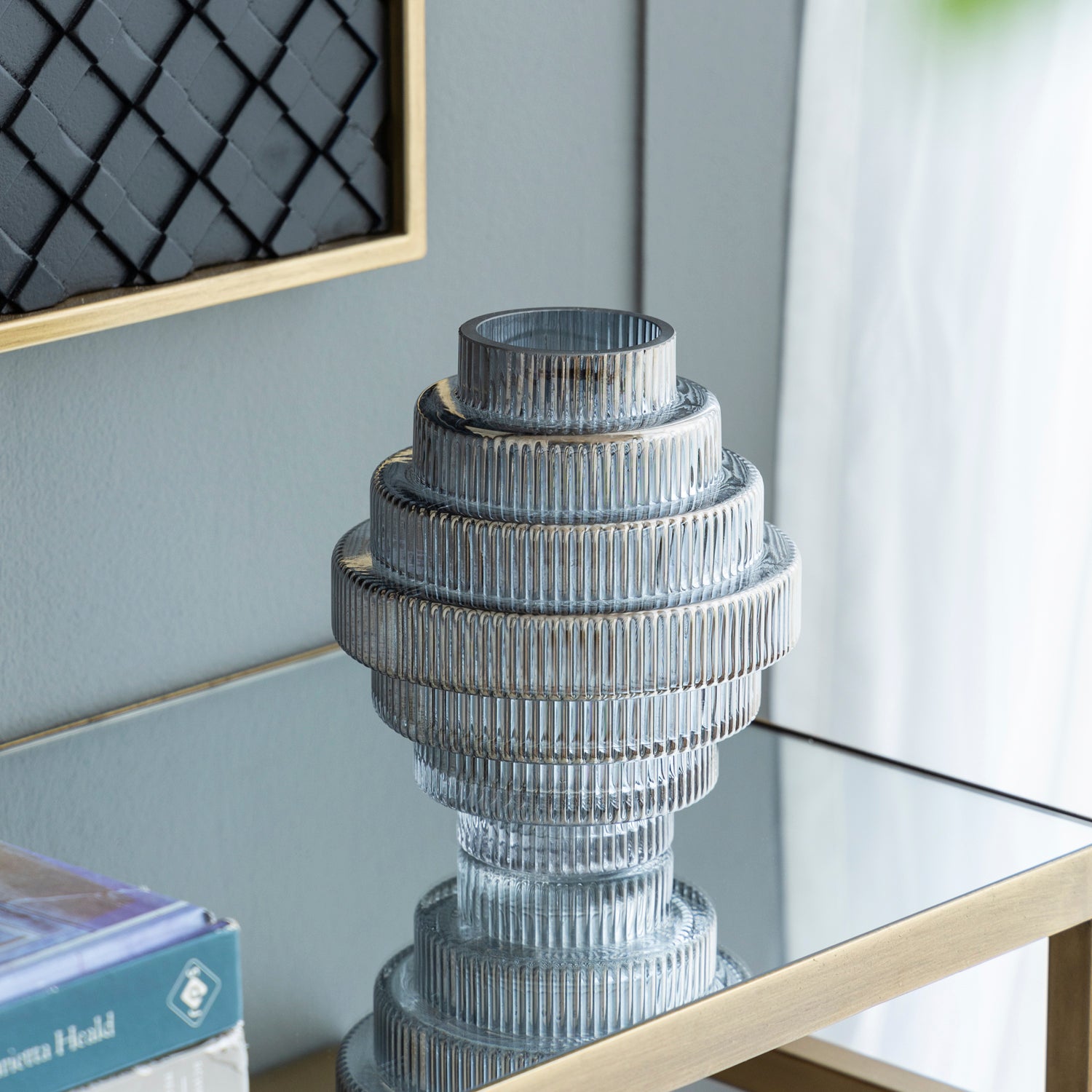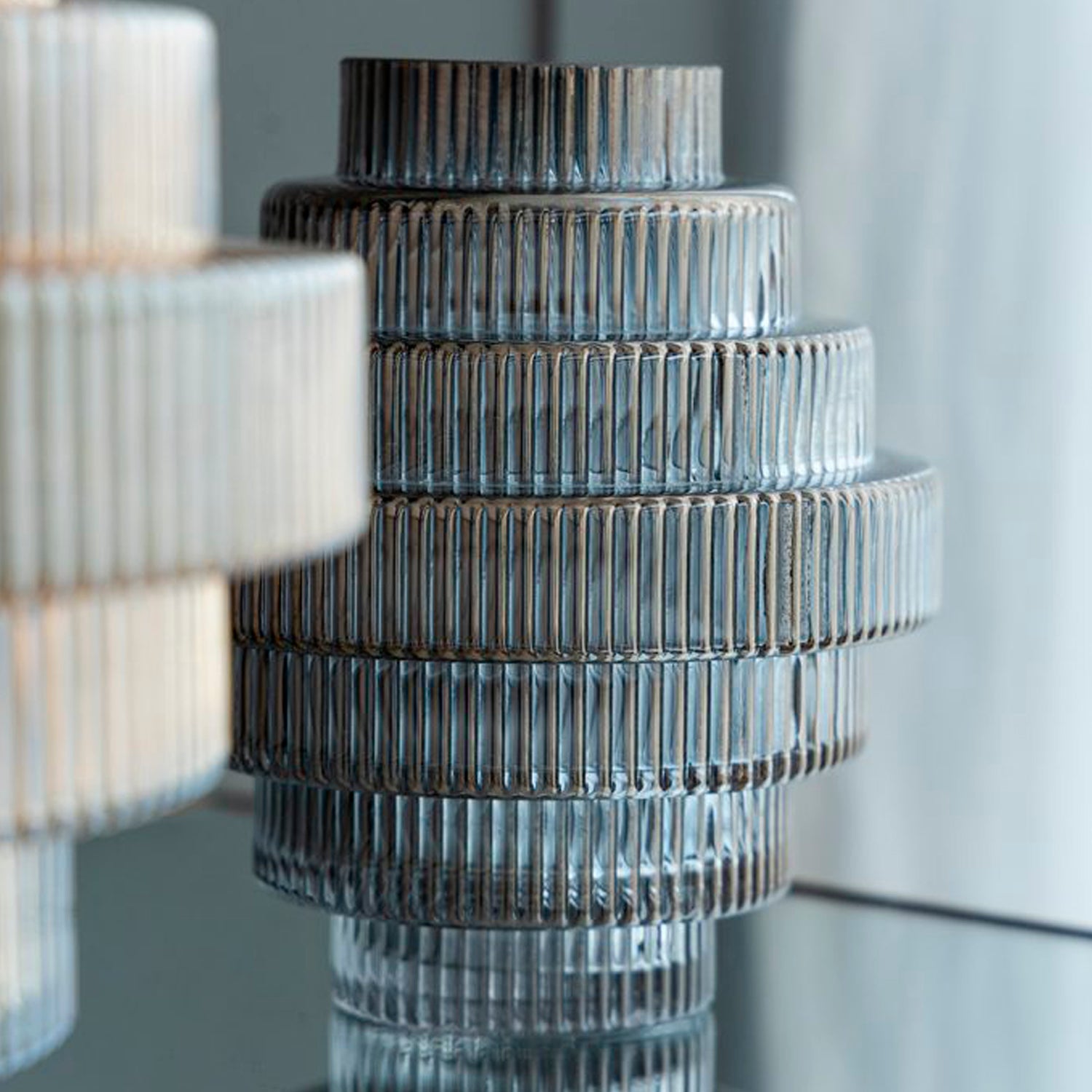 El Jarrón Kivu es una pieza sofisticada que fusiona diseño y elegancia. Elaborado en vidrio, su estructura en niveles y delicadas líneas texturizadas crean un efecto visual único que juega con la luz y realza la belleza de cualquier espacio. Su silueta escultural lo convierte en un elemento decorativo ideal para añadir un toque moderno y refinado a tu hogar.