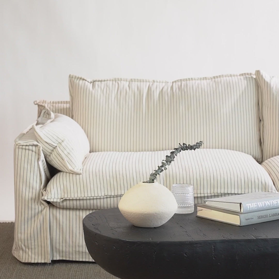 Este sofá minimalista de 3,5 cuerpos se presenta con un sofisticado estampado de rayas verticales en tonos neutros y funda de lino, aportando textura y distinción a cualquier espacio. Sus cojines XL invitan al descanso con un estilo escandinavo refinado.