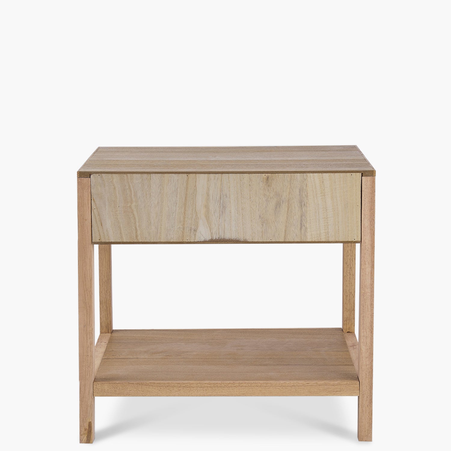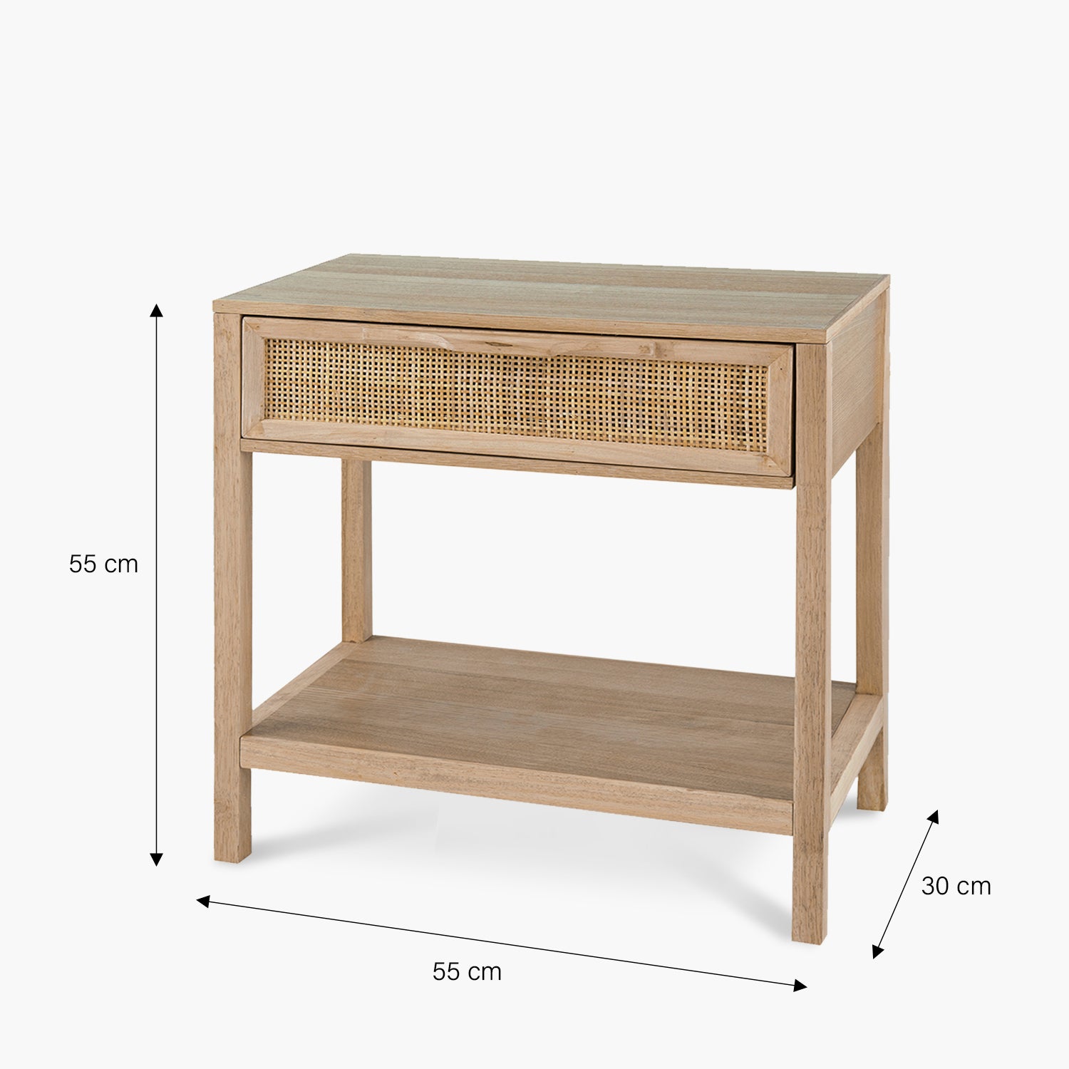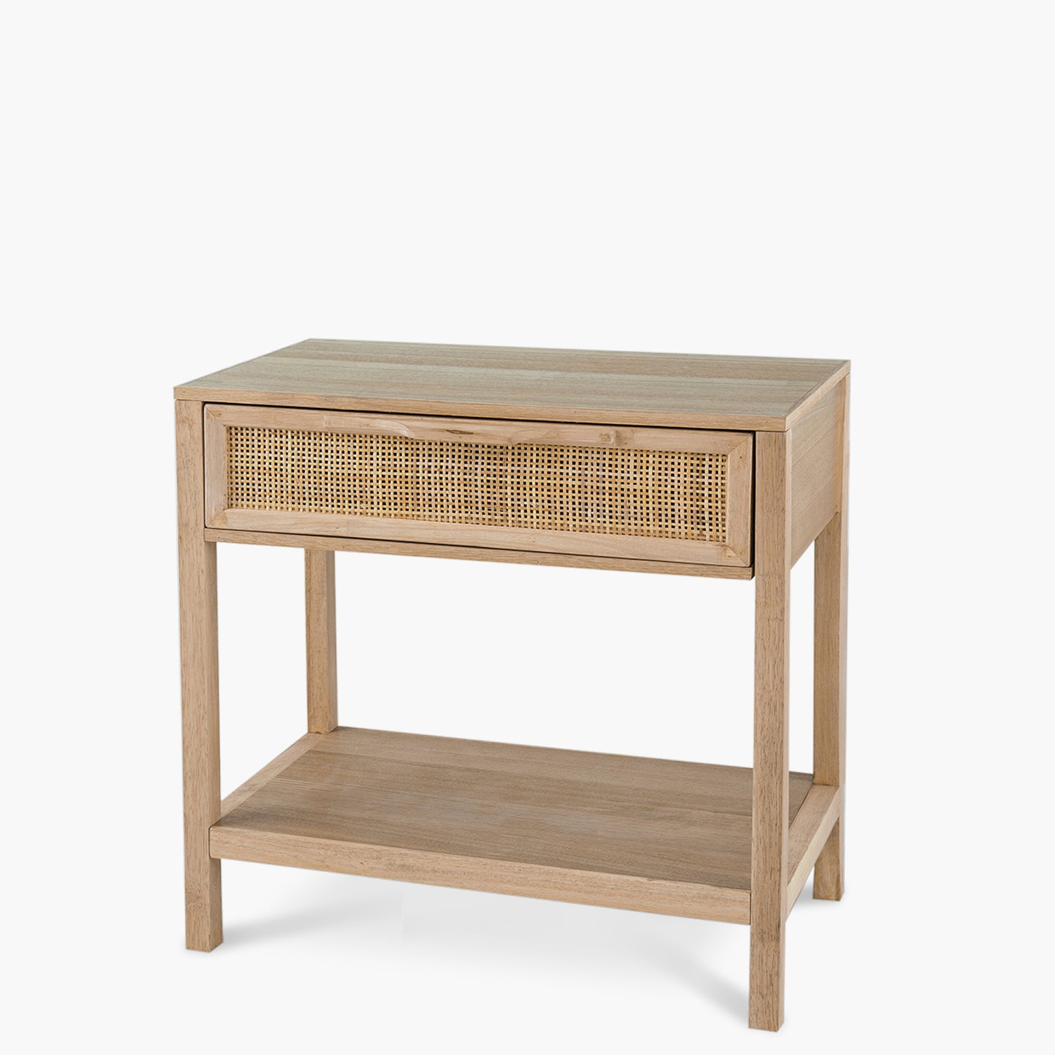 John es un velador de estilo clásico con un acabado natural. Además de su atractivo diseño, este velador cuenta con un cajón para almacenar objetos de fácil acceso y un nivel inferior que permite lucir accesorios decorativos.
